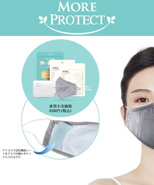 ●商品名:モアプロテクト・毎日マスク安心セット ●商品内容 ・モアプロテクト(ウイルス不活性機能シート)×2枚 ・ポケット付きソフト立体布マスク×1枚 ・銀イオン抗菌 防カビ 防塵マスクケース×1個 ●サイズ/色 ・モアプロテクト:約10×12cm、水色 ・布マスク:縦 約13cm×横 約24cm(耳ひもの部分は除く)、薄グレー色 ・マスクケース:約13×10.5×1.2cm、白 ●素材・材質 ・モアプロテクト:バイオパワーV酵素、不織布 ・マスク:コットン100%、耳ひもの長さは調節可能 ・マスクケース:プラスチック(防カビ素材・銀イオンAg+) ●モアプロテクトの効果継続期間 使用状況により異なりますが、1〜2週間程度は効果が持続します。